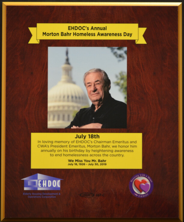 Morton Bahr was Chairman Emeritus of EHDOC, having served our organization with pride, thoughtfulness and dignity for many years. Chairman Emeritus of the Communications Workers of America (CWA), Morton also served as Vice President of Union Network International (UNI) and was former president of UNI’s World Telecom sector, representing 3 million workers in 120 countries. He led the CWA to develop global alliances with counterpart unions in Latin America, Europe and Asia. He was recognized as a leading voice of the labor movement in the United States and internationally. In honor of Mr. Bahr, all EHDOC communities hold Homeless Awareness drives on July 18, his birthday.